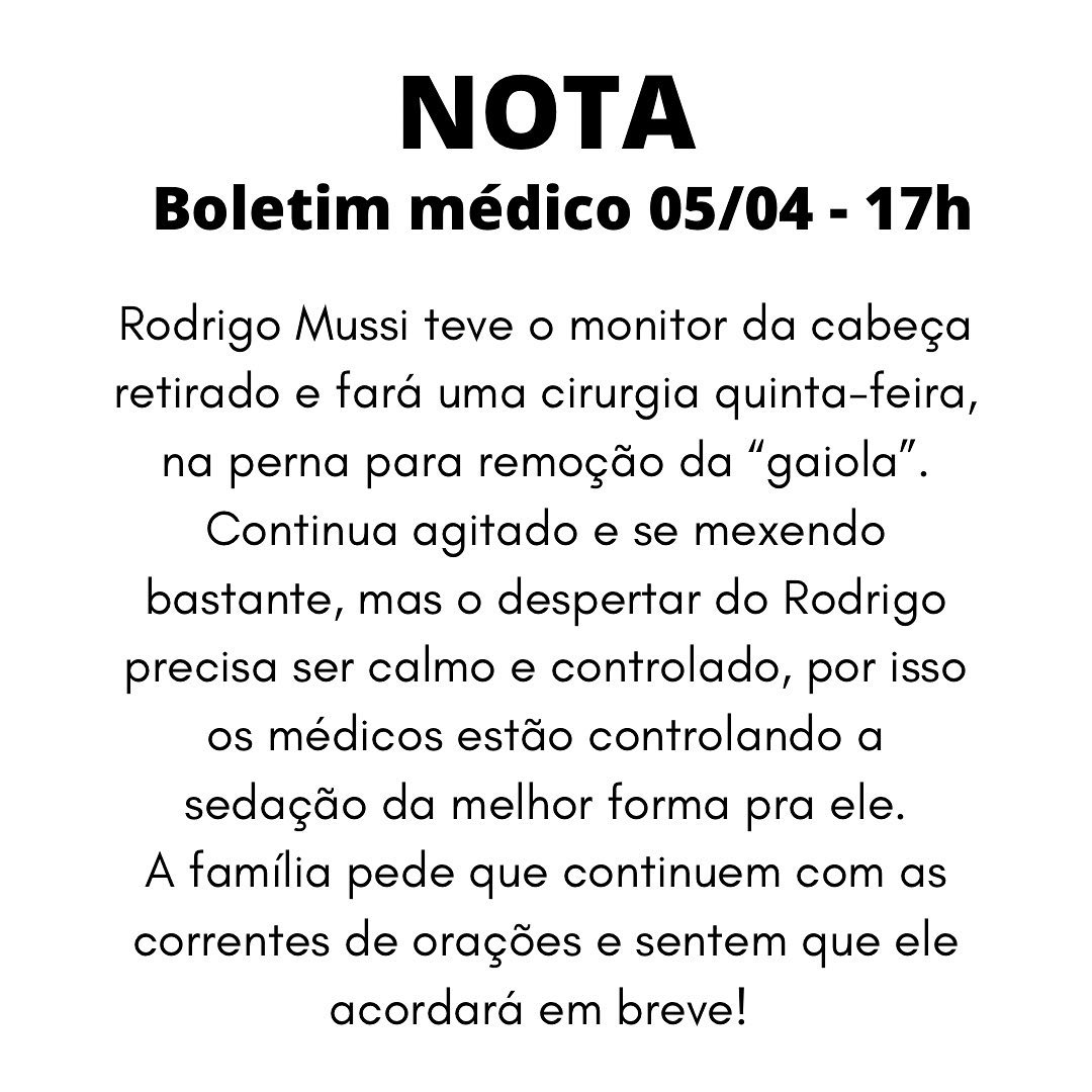 Mussi ainda segue agitado e se mexendo muito, portanto, os médicos estão controlando os sedativos para que ele desperte da melhor maneira possível. Além disso, o monitor implantado na cabeça do ex-participante do Big Brother Brasil 22 foi removido.