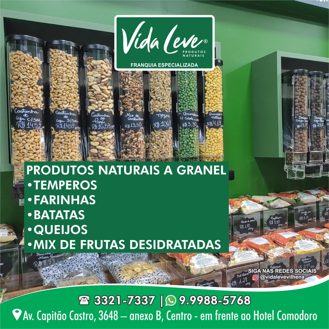 Dia 09 de maio, segunda-feira, a partir das 07:00h da manhã – inaugura em Vilhena - VIDA LEVE – Uma franquia especializada em PRODUTOS NATURAIS: a granel, temperos, farinhas, batatas, queijos, mix de frutas desidratadas.