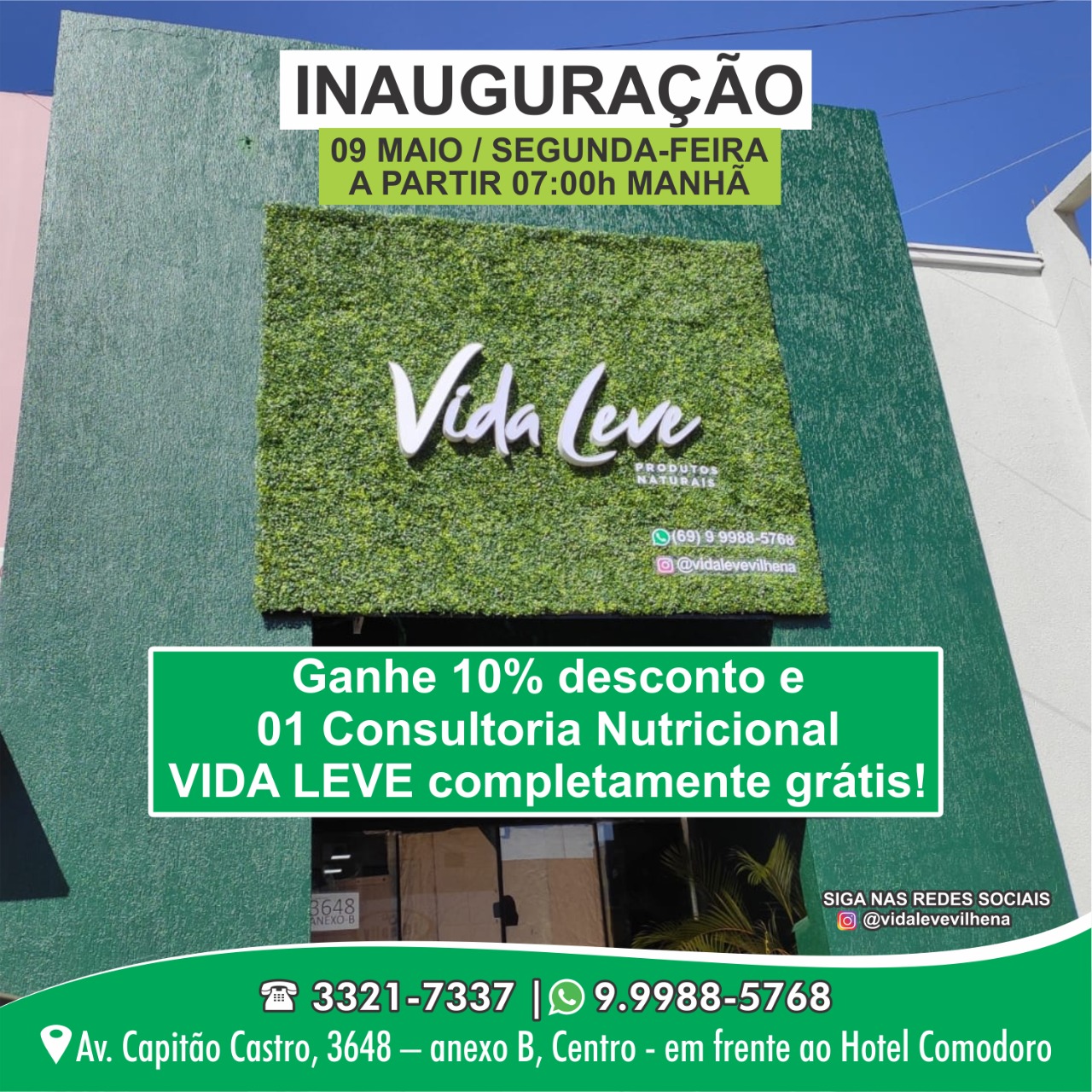 No dia da inauguração, ganhe 10% desconto e 01 Consultoria Nutricional VIDA LEVE completamente grátis!