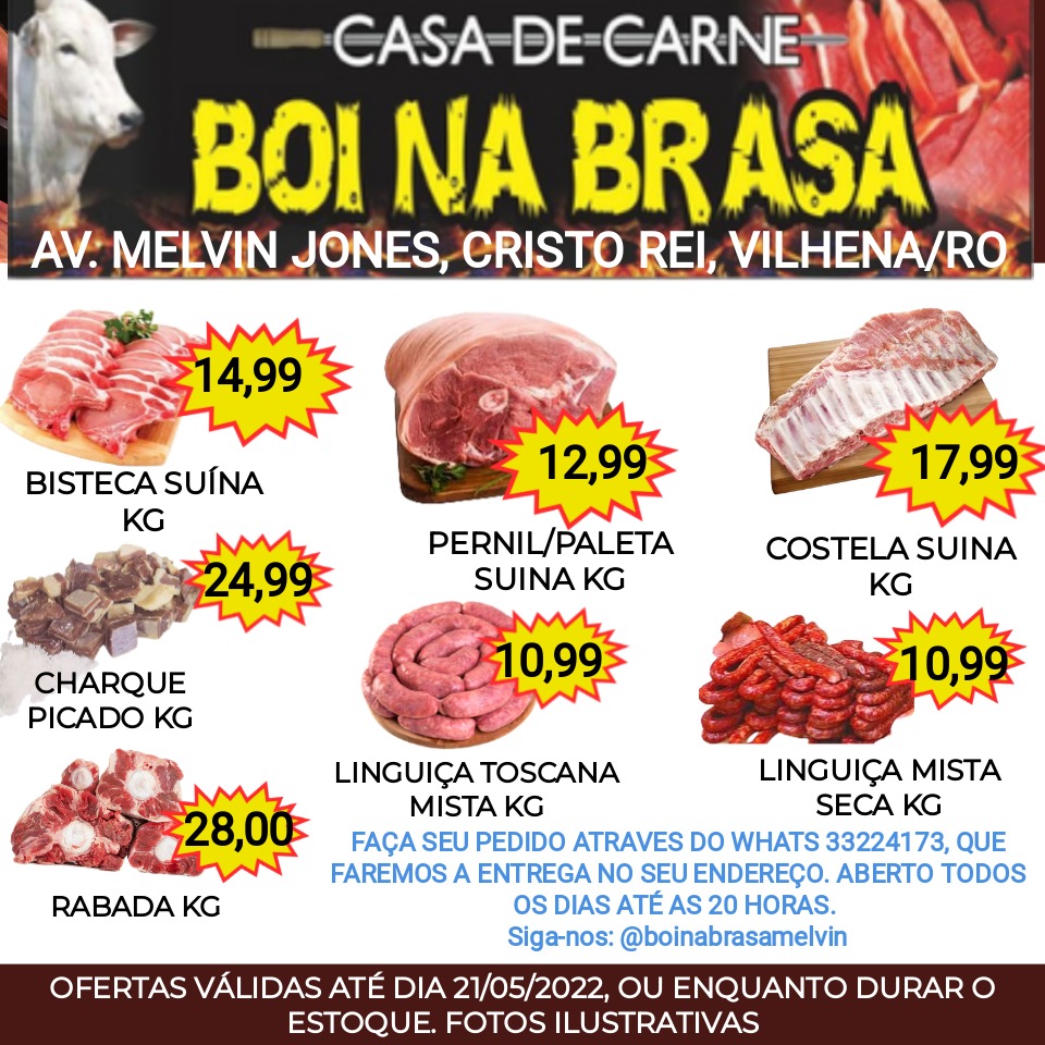 BOI NA BRASA DA AVENIDA MELVIN JONES, BAIRRO CRISTO REI, VILHENA/RO, ONDE É BARATO COMPRAR TODOS OS DIAS. FAÇA SEU PEDIDO ATRAVES DO WHATS 33224173, QUE FAREMOS A ENTREGA NO SEU ENDEREÇO. ABERTO TODOS OS DIAS ATÉ AS 20 HORAS.