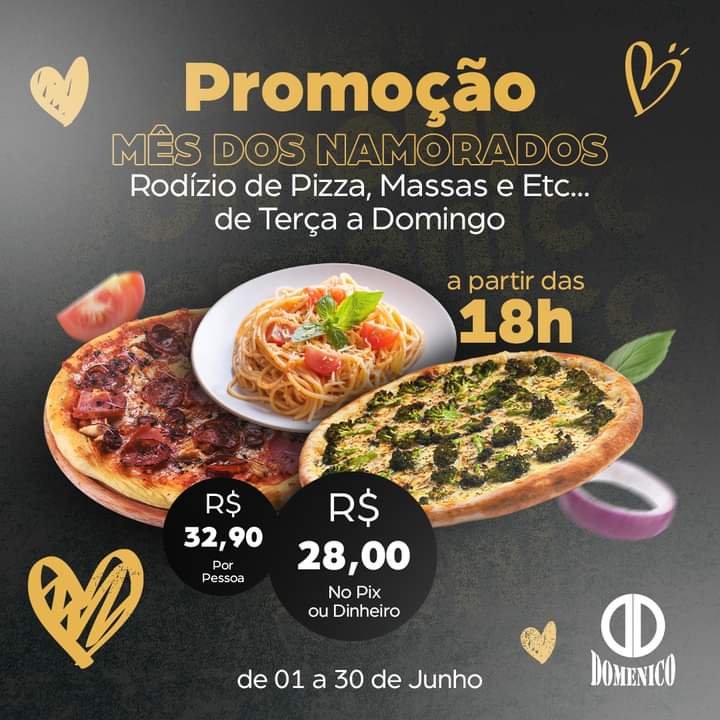 Neste “MÊS DOS NAMORADOS”, a PROMOÇÃO está “apaixonante” na PIZZARIA DOMENICO!!!