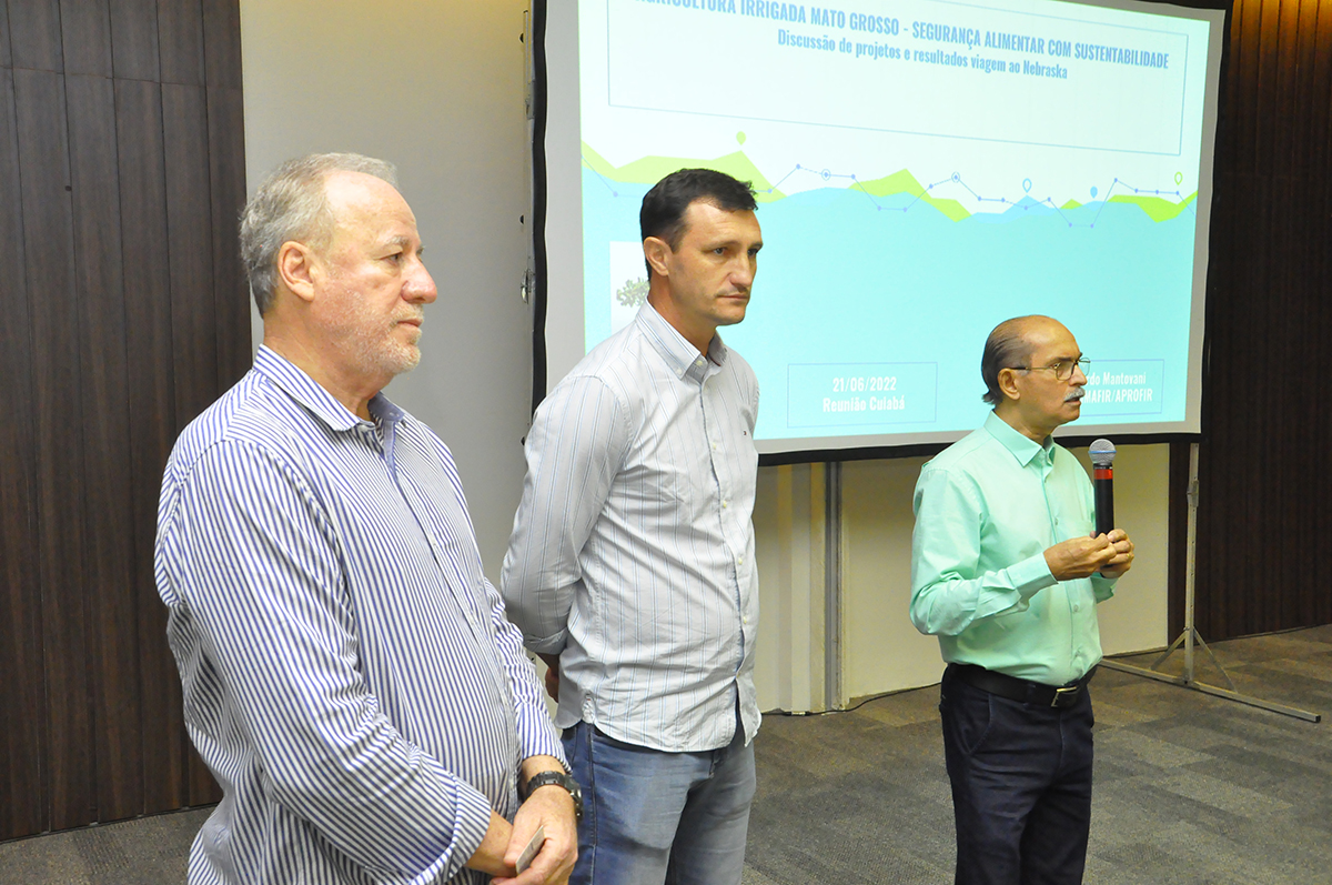 A Associação dos Produtores de Feijão, Pulses, Grãos Especiais e Irrigantes de Mato Grosso (APROFIR-MT), em parceria com Fórum Mato-Grossense da Agropecuária realizou nesta terça-feira (21), em Cuiabá, uma reunião que discutiu sobre a agricultura irrigada em Mato Grosso e a segurança alimentar com sustentabilidade. Na oportunidade também, a APROFIR-MT apresentou um relatório sobre a missão internacional ao estado do Nebraska (EUA), onde foi conhecido o sistema de irrigação da região, bem como foi anunciado um plano de estudos para a irrigação em Mato Grosso.