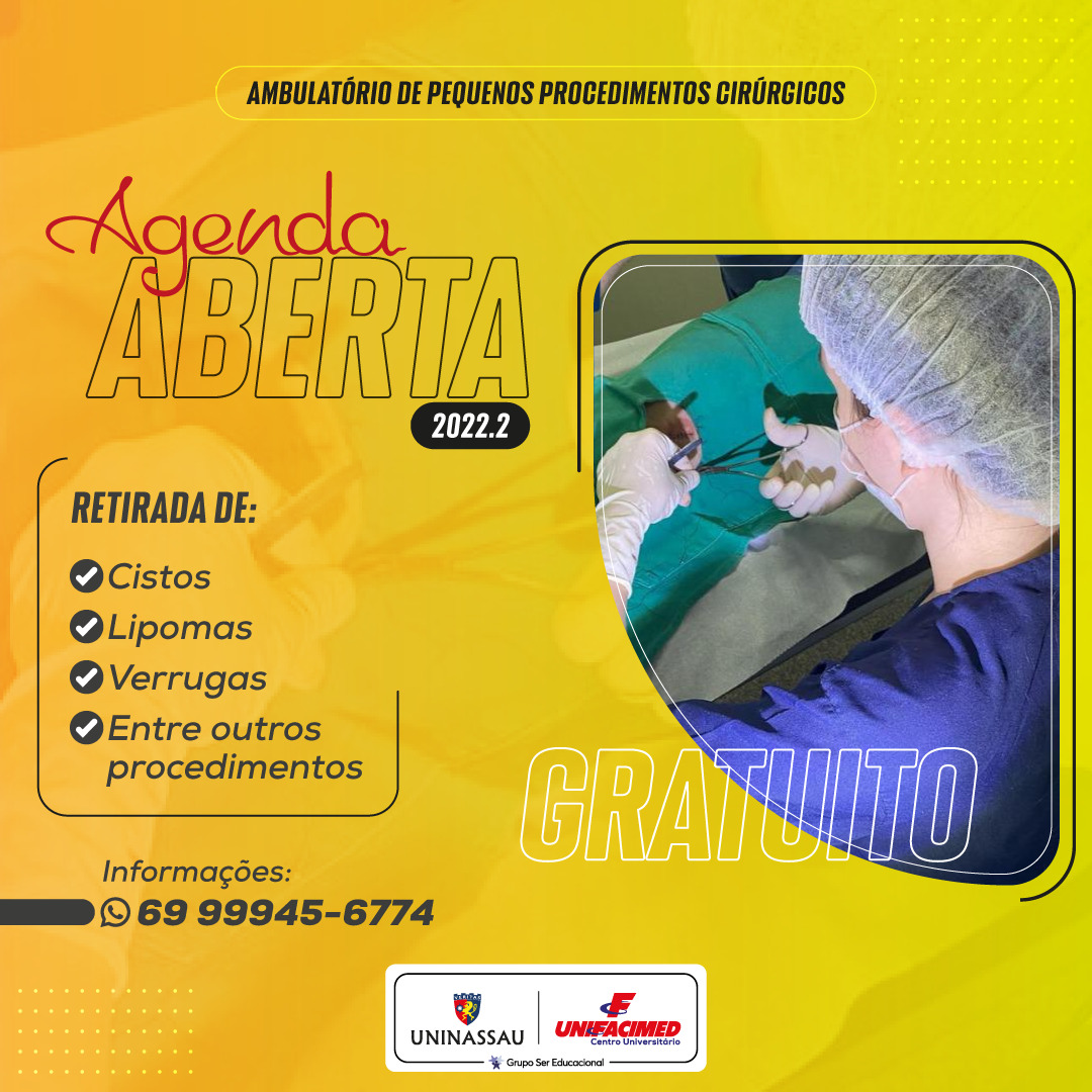 Os pequenos procedimentos cirúrgicos incluem a retirada de cistos, lipomas, verrugas, entre outros. Todo atendimento é feito de forma gratuita e acontece no Centro Cirúrgico Ambulatorial da Instituição, que fica localizado na Unidade I da UNINASSAU/UNIFACIMED, na Avenida Rosilene Transpadini, número 2070, bairro Jardim Eldorado.