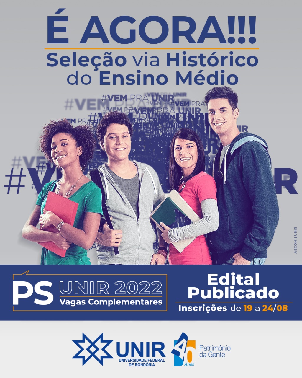 A Universidade Federal de Rondônia (UNIR) publicou nesta segunda-feira, dia 15, Edital Complementar do PS UNIR 2022, para seleção de candidatos por meio de notas do Ensino Médio. No total estão sendo oferecidas 1.192 vagas para 41 cursos nos campi de Ariquemes, Cacoal, Guajará-Mirim, Ji-Paraná, Porto Velho, Presidente Médici, Rolim de Moura e Vilhena. A relação de cursos e de vagas disponíveis por curso pode ser consultada aqui. As inscrições acontecem entre os dias 19 e 24 de agosto, e todo o processo deve ser realizado online, por meio deste link: https://sistemas.unir.br/discente. Todo o processo de inscrição e confirmação das inscrições será realizado de modo online.