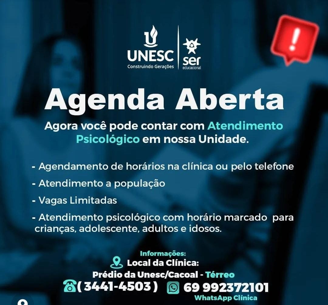 Os agendamentos para as vagas podem ser realizados por meio do telefone (69) 3441-4503 ou WhatsApp (69) 99237-2101, de segunda à sexta-feira, das 14h às 22h. Os atendimentos acontecem na UNESC Cacoal, que fica localizada na Rua dos Esportes, 1038, bairro Incra.
