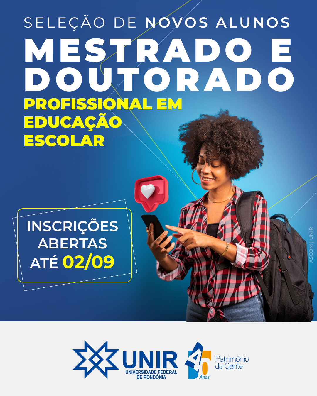 Encerram nesta sexta-feira (2) as inscrições para os cursos de mestrado e doutorado profissional do Programa de Pós-graduação em Educação Escolar (PPGEEProf) da Universidade Federal de Rondônia (UNIR). São ofertadas 30 vagas para mestrado e 15 para doutorado, todas destinadas a professores e profissionais da educação básica da rede pública de ensino, e as inscrições devem ser realizadas pelo Sistema Sigaa/UNIR, neste link.