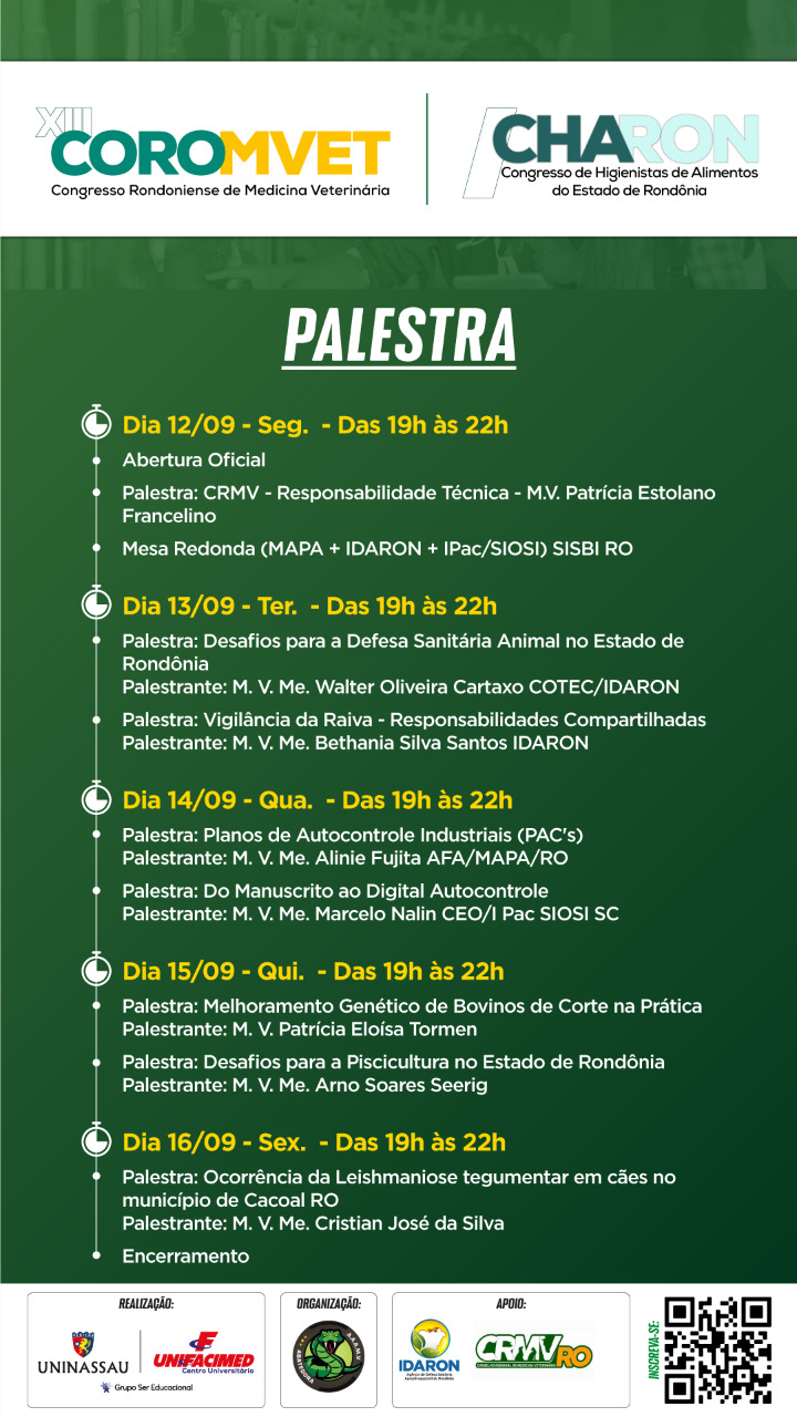 A UNINASSAU/UNIFACIMED, em parceria com o Conselho Regional de Medicina Veterinária de Rondônia (CRMV-RO) e a Agência de Defesa Sanitária Agrosilvopastoril de Rondônia (IDARON), irá realizar, entre os dias 12 e 16 de setembro, o XIII Congresso Rondoniense de Medicina Veterinária (COROMVET) e o I Congresso de Higienistas de Alimentos do Estado de Rondônia (CHARON). O COROMVET é o principal evento técnico-científico do estado direcionado aos profissionais e acadêmicos da área.