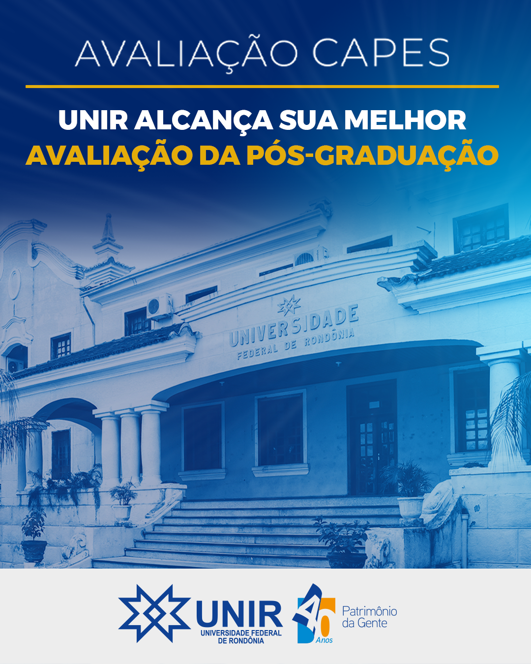 A Universidade Federal de Rondônia (UNIR) recebeu avaliações positivas para seus programas de pós-graduação, mestrados e doutorados, na avaliação quadrienal da Coordenação de Aperfeiçoamento de Pessoal de Nível Superior (Capes), divulgada na última semana, no dia 12 de setembro. Mais da metade dos PPGs ofertados tiveram suas notas ampliadas, o que foi comemorado pela Universidade, o que faz deste resultado o melhor já obtido pela UNIR: “É uma grande notícia para a nossa instituição, mas não apenas para a UNIR, e sim para todo o nosso Estado, pois com isso a qualidade da nossa pós-graduação é reconhecida e poderemos ampliar a oferta de cursos de doutorado, formando ainda mais pesquisadores de Rondônia”, destacou a reitora da UNIR, professora Marcele Pereira.