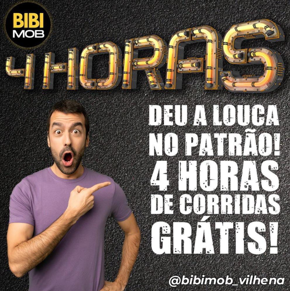 O Patrão mandou avisar que Sexta-Feira dia 28/10/2022 das 17:00 horas até às 21:00 horas os clientes que utilizarem o cupom BIBI100 terão 100% de desconto em suas corridas, é isso mesmo, você vai andar de BIBI MOB de graça!