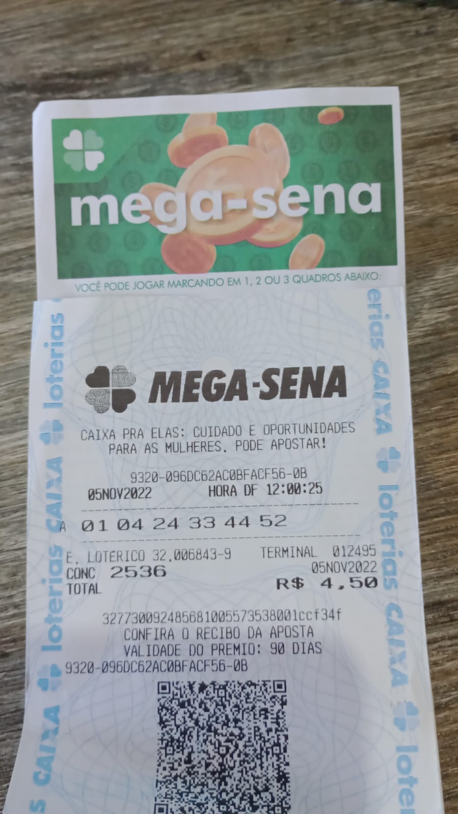 O "palpite" escolhido para o "BOLÃO DA ONDA" foi: 01 – 04 – 24 – 33 – 44 – 52 (Conc 2536 da Mega Sena)