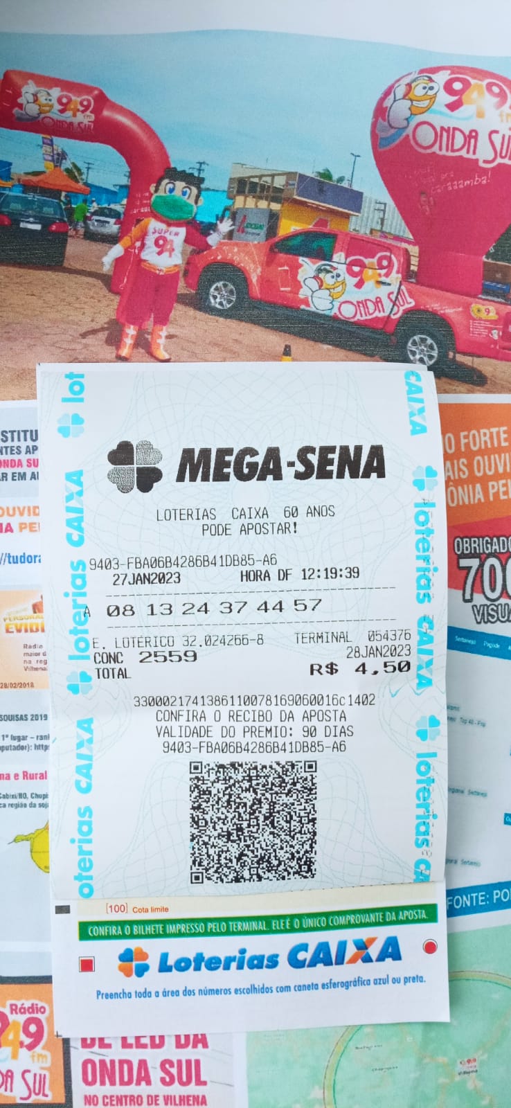 O "palpite" escolhido para o "BOLÃO DA ONDA" foi: 08 – 13 – 24 – 37 – 44 – 57 (concurso 2559 da Mega Sena)