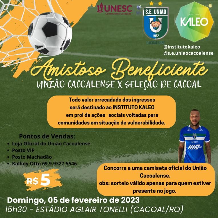 A UNESC e a Sociedade Esportiva União Cacoalense se uniram em prol de um amistoso beneficente que será realizado neste domingo (5), às 15h30, no Estádio Aglair Tonelli. Todo o lucro dos ingressos será doado para o Instituto Kaleo. A organização não governamental (ONG) atua no desenvolvimento humano por meio da elaboração de projetos voltados para as áreas de saúde e educação.