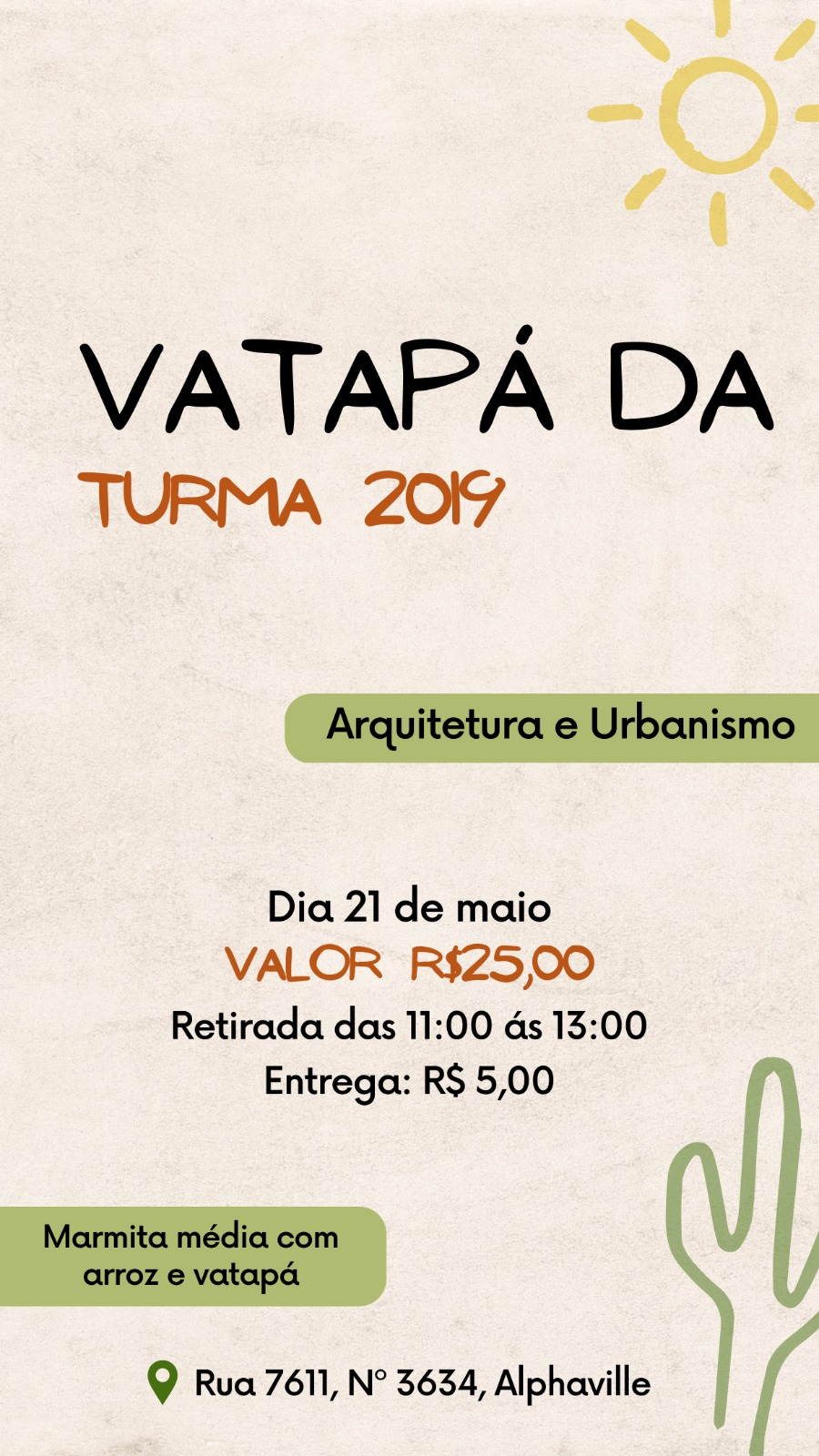Neste Domingo dia 21 de Maio terá um delicioso vatapá para arrecadação de fundos para a formatura da turma de Arquitetura e Urbanismo da faculdade, além da colaboração ainda irá garantir um almoço para duas pessoas...