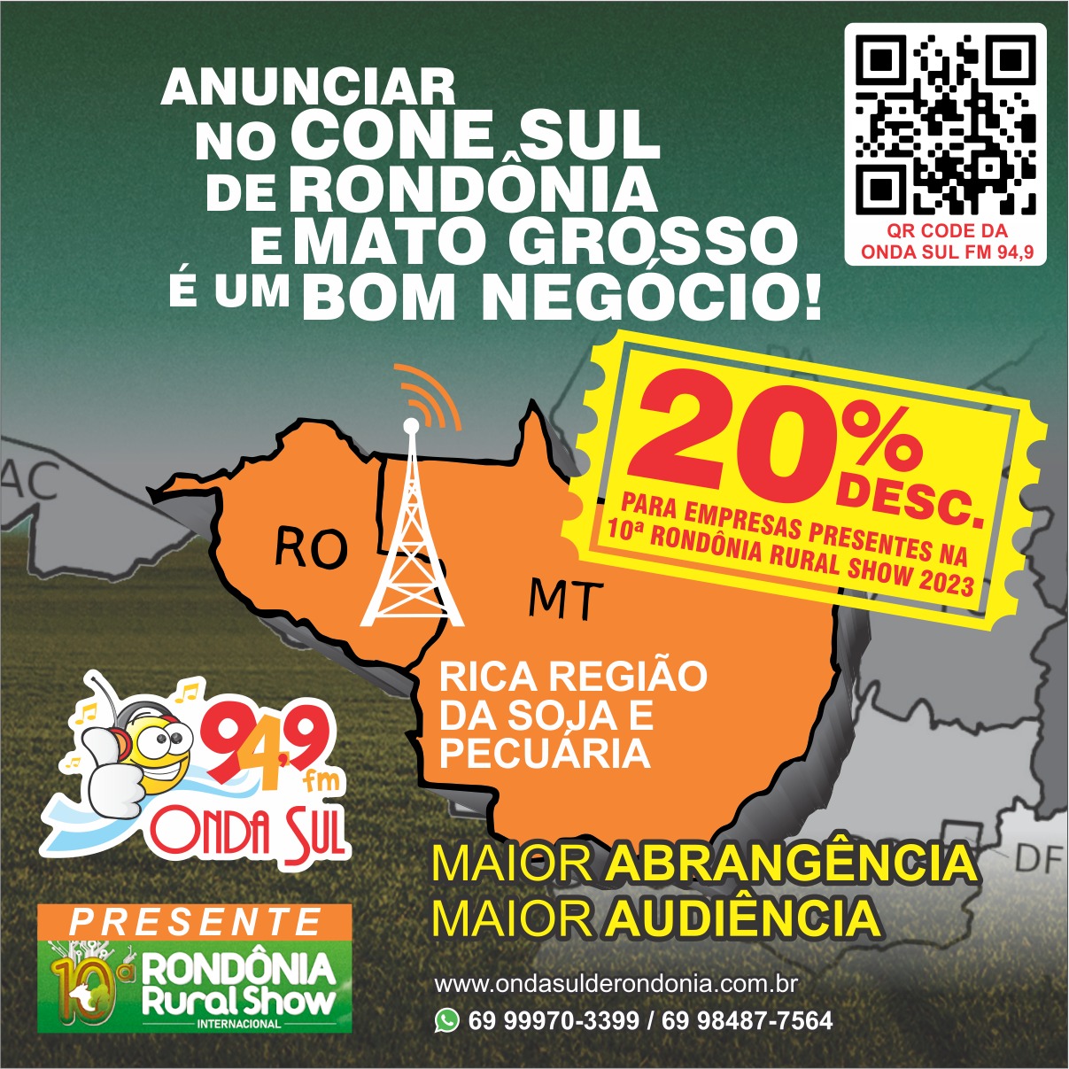 A Onda Sul Fm 94,9 (forte emissora do Agro) estará presente na 10ª RONDÔNIA RURAL SHOW INTERNACIONAL 2023, ocasião em que a rádio também estará lançando a nova Edição da REVISTA ONDA SUL – IMPRESSA, com distribuição nas principais cidades do estado de Rondônia.