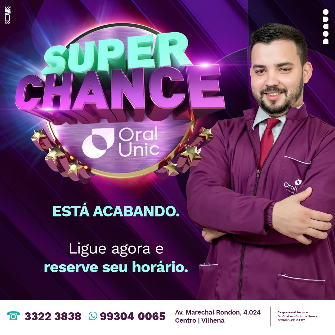 A Super Chance vai até 30 de junho, e você pode entrar em contato pelo telefone (69) 3322-3838 ou no WhatsApp (69) 99304-0065 e garantir o seu horário. A Oral Unic Vilhena fica na Av. Marechal Rondon, 4.024 - Centro. Com a sua clínica odontológica premium, Oral Unic, você vive de frente!