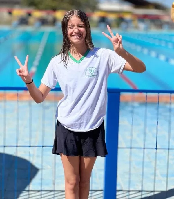 Ana Julia, de 13 anos, recebeu uma medalha de bronze e uma de ouro e foi classificada com a prova 50 metros nado livre, com o tempo 35”38