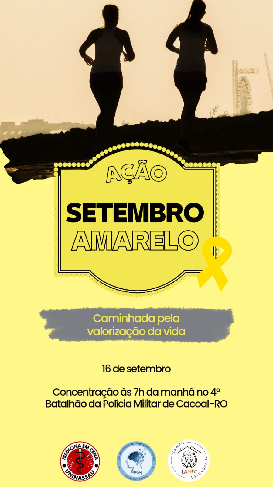 Neste sábado (16), a partir das 7h, acontece, em frente ao 4º Batalhão da Polícia Militar (PM), a concentração para a Caminhada da UNINASSAU Cacoal em prol da Campanha Setembro Amarelo. O evento conta com a parceria da Liga Acadêmica de Psiquiatria de Cacoal, da Medicina em Cena da Liga acadêmica de Medicina da Família e Comunidade com a PM.