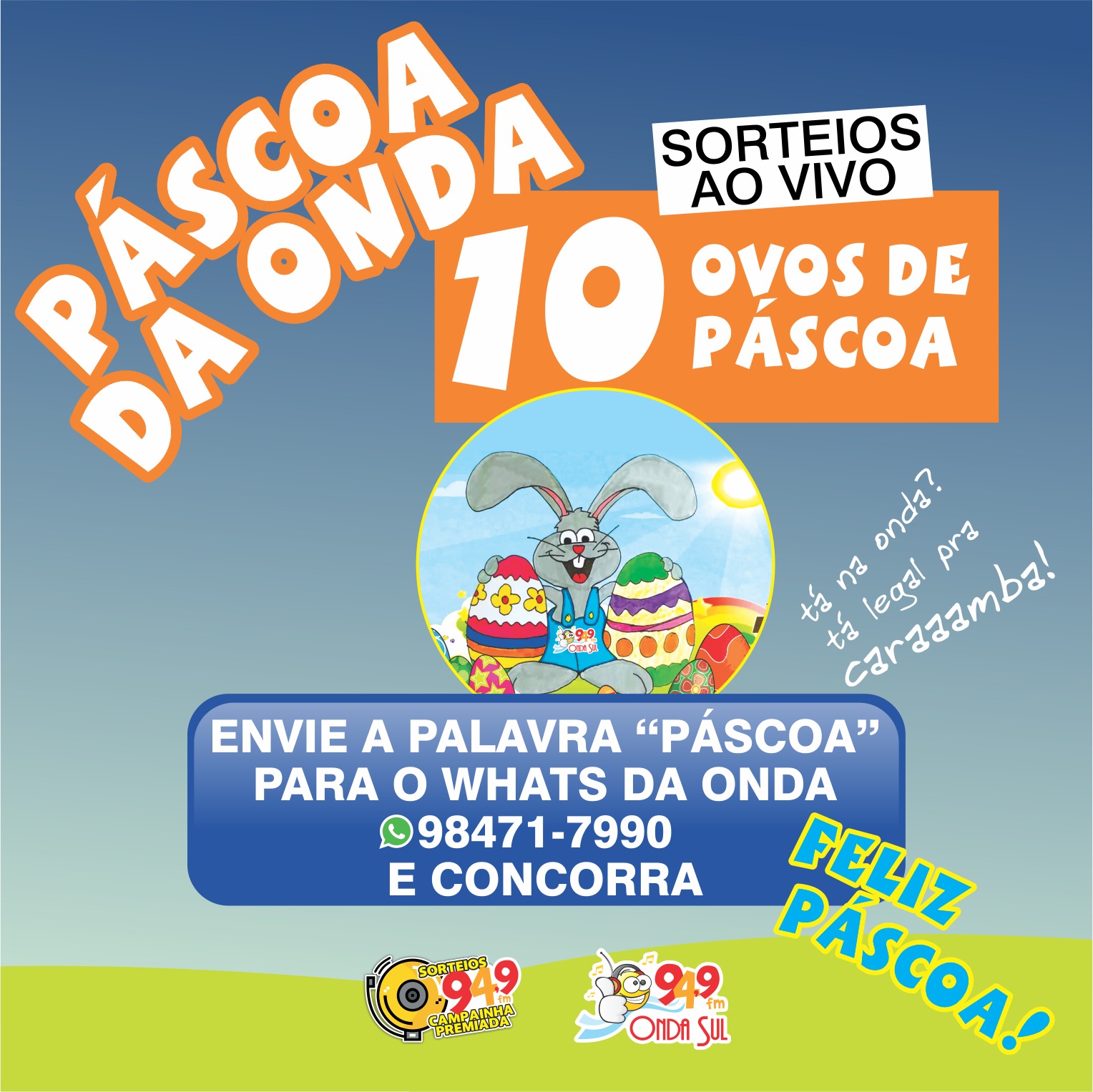 Basta enviar a palavra “PÁSCOA” para o whats da onda: 9.8471-7990 ...daí se liga na PROGRAMAÇÃO da rádio e aguarde a CAMPAINHA PREMIADA tocar !