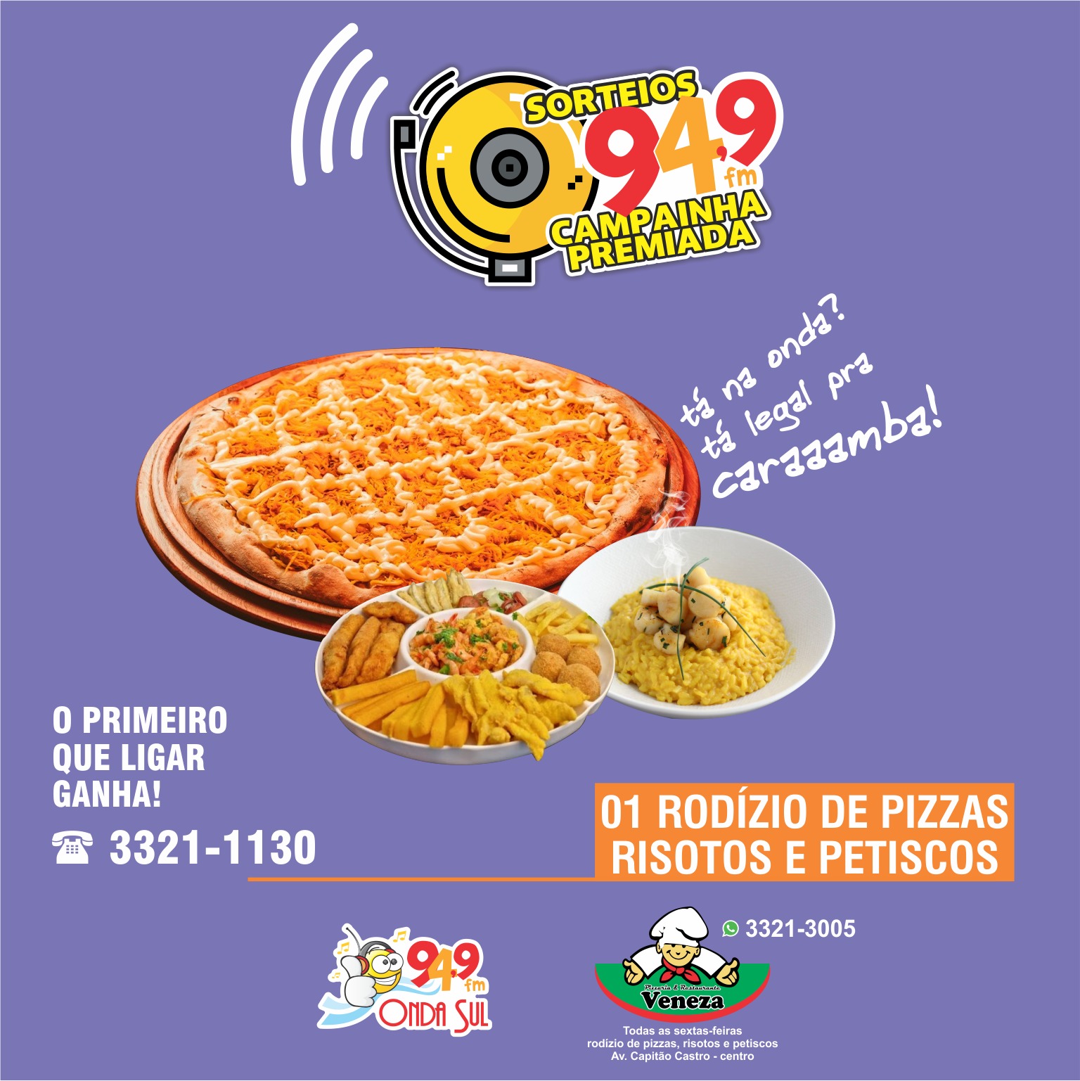 Fiquem ligados na programação da ONDA SUL FM 94,9 ao toque da CAMPAINHA PREMIADA do RESTAURANTE & PIZZARIA VENEZA...tocou, ouviu, ligou, ganhou!!!
