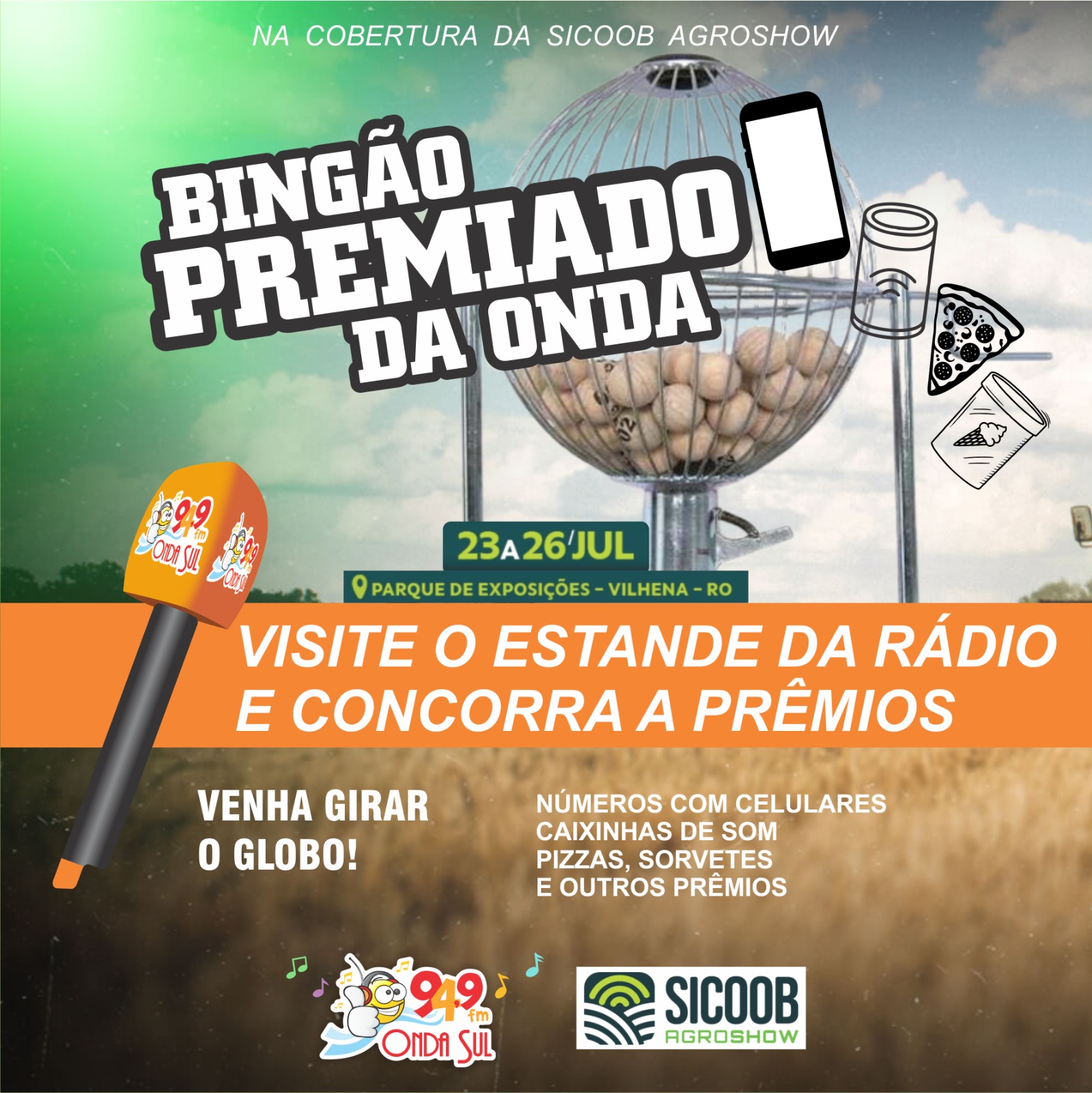 Além de toda cobertura oficial da SICOOB AGROSHOW com flashes e entrevistas ao vivo, fotos, reportagens especiais, a emissora, líder em audiência e entretenimento na grande região do cone sul de Rondônia e Mato Grosso, traz mais uma novidade no estande da rádio - o BINGÃO PREMIADO DA ONDA, onde os visitantes poderão girar o globo e tirar números com celulares, caixinhas de som, pizzas, sorvetes, churrascão e muitos outros prêmios. É só visitar o estande da ONDA SUL FM 94,9 no Parque de Exposições e participar dessa divertida brincadeira. Pode girar o globo 1 vez por pessoa!