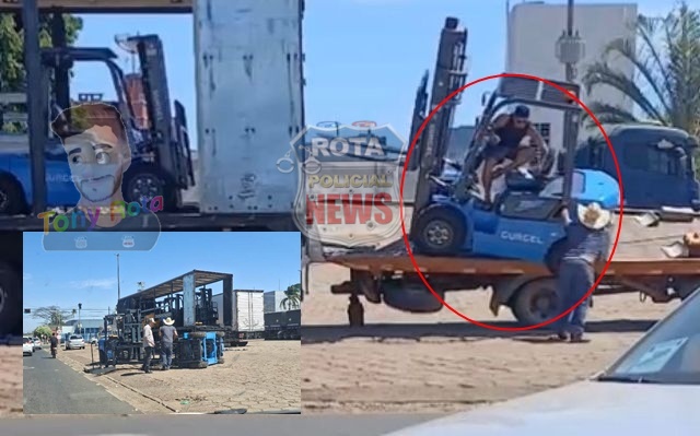 Imagens registradas por uma internauta do Rota Policial News flagraram o exato momento em que a empilhadeira, durante a manobra de subida na prancha, perde o equilíbrio e tomba para fora do caminhão, caindo na calçada. No vídeo, é possível ver o motorista da máquina pulando no último instante, escapando ileso do acidente.Apesar da cena impressionante, apenas danos materiais foram constatados. A empilhadeira sofreu avarias ao atingir o chão, mas não houve feridos.