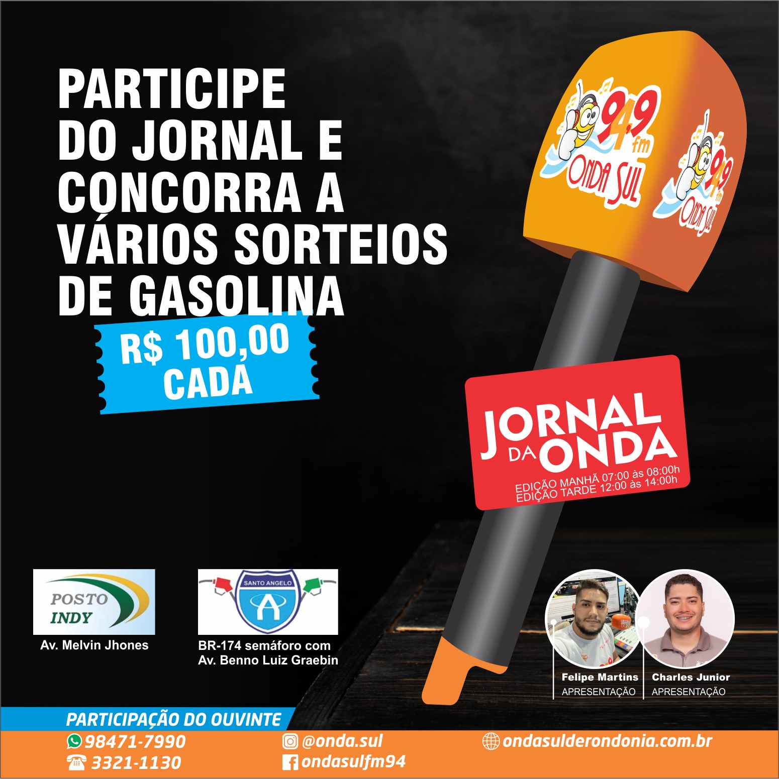 Participe do JORNAL DA ONDA – de MANHÃ ou a TARDE – e concorra, toda semana ao vivo no JORNAL, a 02 requisições de gasolina de R$ 100,00 cada!!!