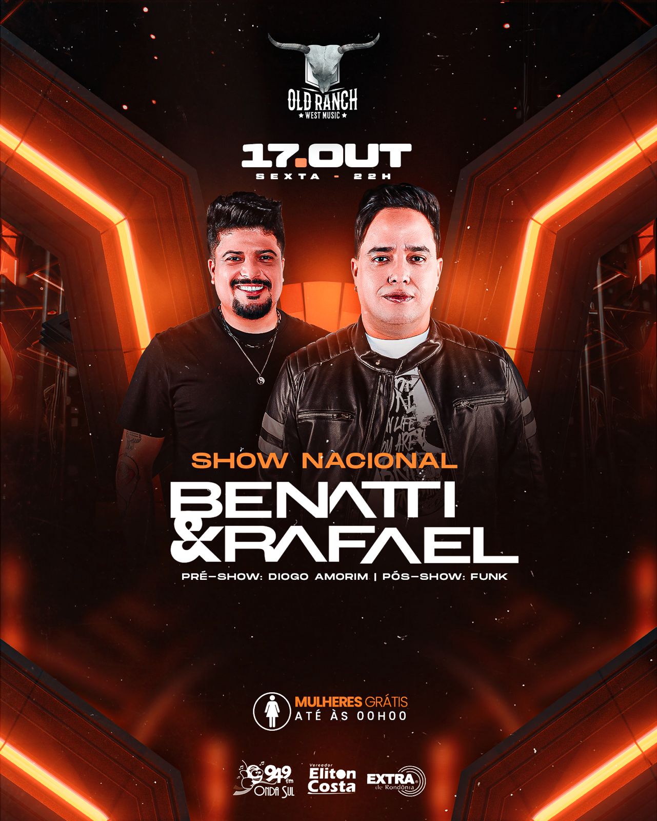 Nesta sexta-feira, dia 17 de outubro, a dupla de sucesso nacional Benatti & Rafael estará se apresentando ao vivo no OLD RANCH, em Vilhena. Depois de gravar seu DVD ao lado de grandes nomes da música sertaneja, como Edson & Hudson e Diego & Victor Hugo, Benatti & Rafael se preparam para mais um show incrível.