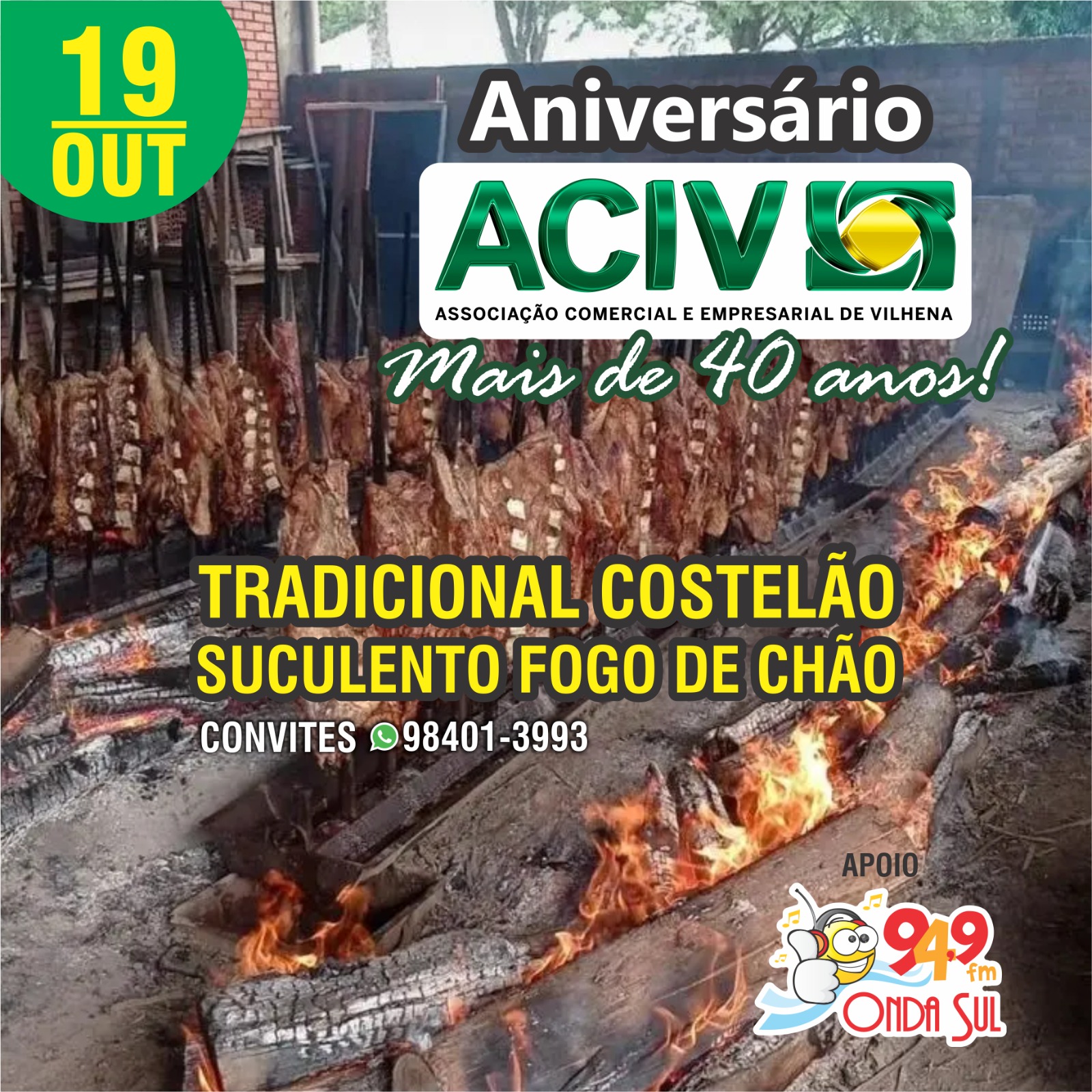Prepare-se para saborear aquele tradicional costelão suculento a fogo de chão e viver um domingo de muita confraternização, no almoço de Aniversário da ACIV - ASSOCIAÇÃO COMERCIAL E EMPRESARIAL DE VILHENA