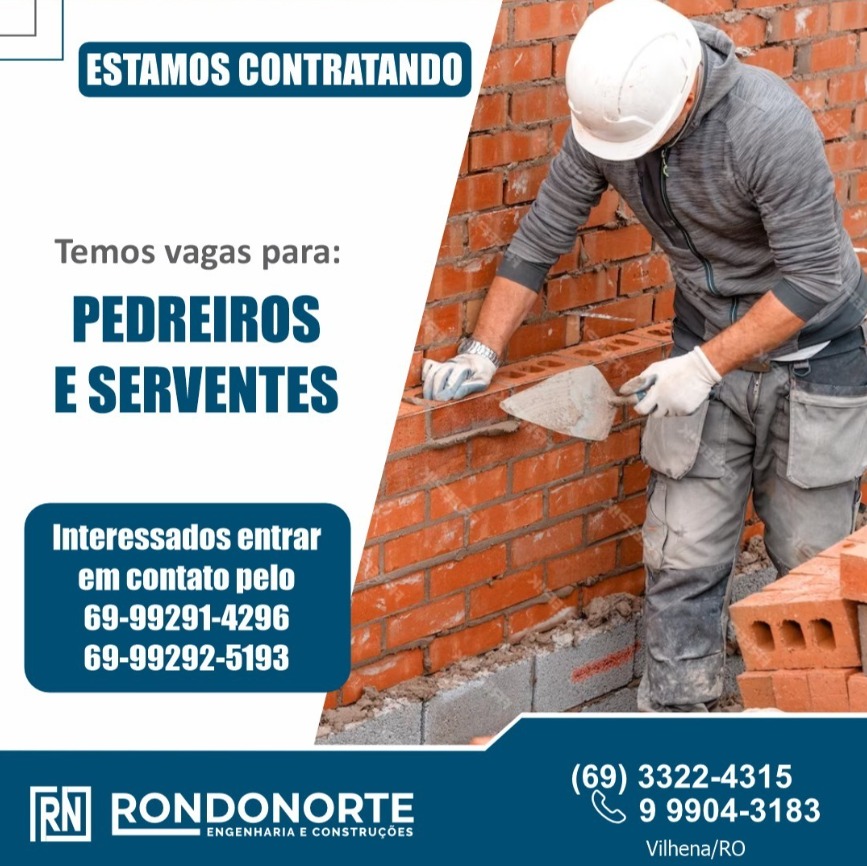RONDONORTE comunica que está contratando pedreiros, serventes, montadores de estruturas metálicas e ajudantes de soldador ( contatos: 69 99291–4296 e 69 99292–5193 )