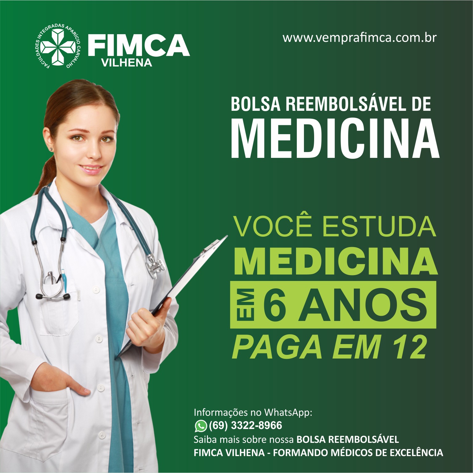 Com nossa bolsa reembolsável de medicina, você estuda medicina em 6 anos, e paga em 12. Bolsa de até 50%.