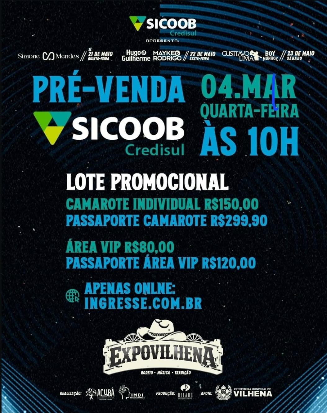 PRÉ–VENDA EXPOVILHENA 2026 na SICOOB ! ( Dia 04/03 quarta–feira às 10:00h )