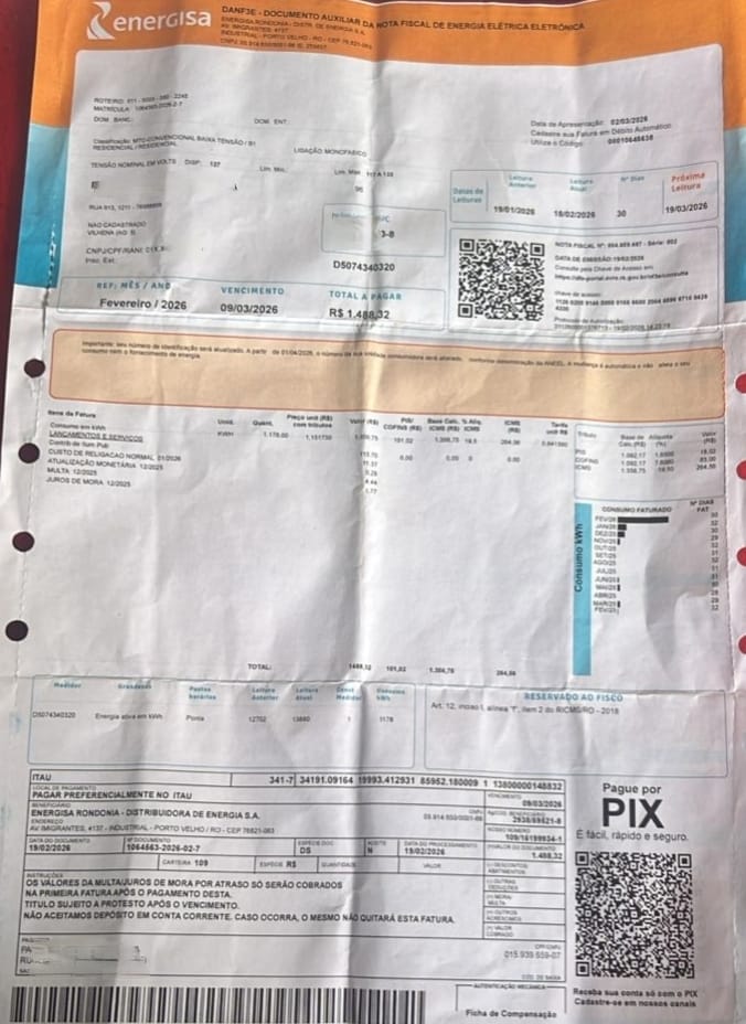Estão deixando nas casas algumas faturas de energia falsa em Vilhena. Ao pagar, o valor vai para a conta de estelionatários.