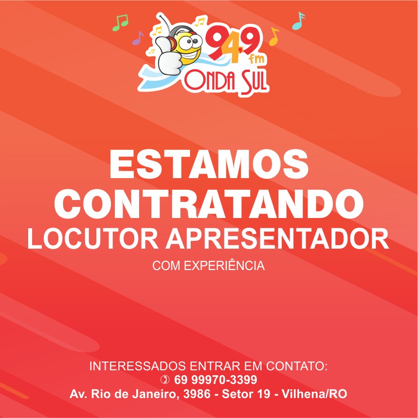 ONDA SUL FM 94,9 está contratando Locutor Apresentador profissional ( contato: 69 99970–3399 )