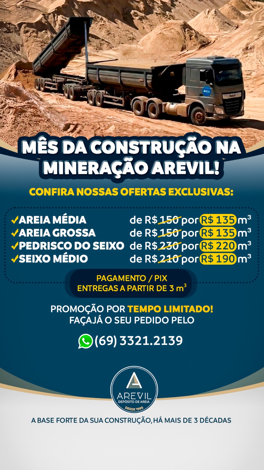 Areias e pedras com “preços imbatíveis” é só no MÊS DA CONSTRUÇÃO na MINERAÇÃO AREVIL ! ( Faça já o seu pedido – Ligue: 3322–3948 ou whats: 3321–2139 )