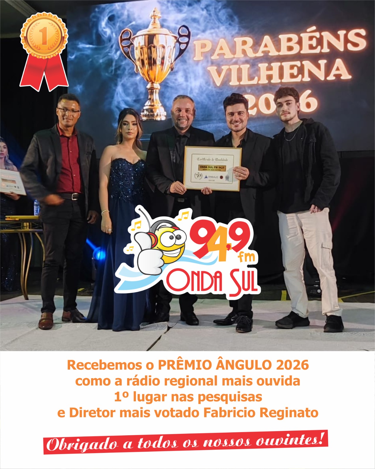 ONDA SUL FM 94,9 recebeu PRÊMIO ÂNGULO 2026 como a rádio regional mais ouvida 1º lugar nas pesquisas e Diretor mais votado Fabricio Reginato! ( Obrigado a todos os nossos ouvintes! )