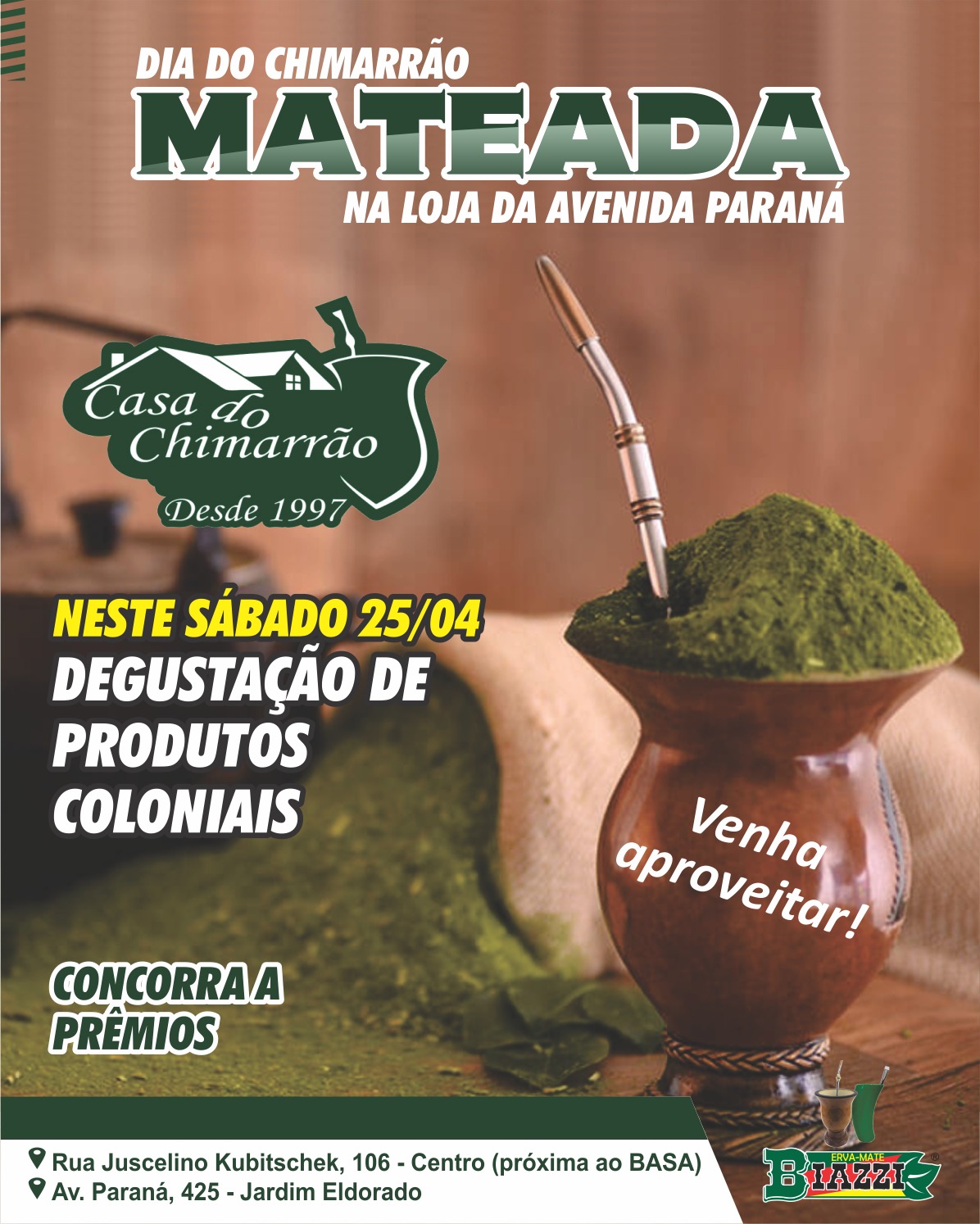 Neste sábado (25/04) sensacional MATEADA na CASA DO CHIMARRÃO da Av. Paraná !!! ( Com degustação e sorteios de prêmios ). Venha aproveitar !!!