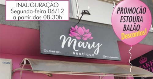 MARY BOUTIQUE – moda feminina – INAUGURA nesta segunda–feira (06/12) às 08:30h da manhã com PROMOÇÃO ESTOURA BALÃO para os primeiros clientes (Av. Curitiba, 1141 Jardim Primavera)