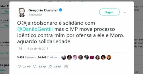 Após apoio de Bolsonaro a Gentili, Duvivier diz que também aguarda solidariedade